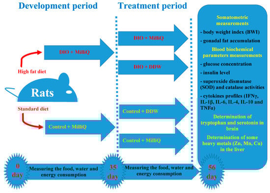 On the 35th day after the start of the experiment, half of the animals from the control and DIO groups were randomly selected and subjected to the treatment. These rats had ad libitum access to deuterium-depleted water (DDW) for the next 3 weeks. The other animals from each group had ad libitum access to MilliQ water for the same period. The scheme of the experimental design is shown in Figure 4.