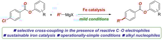 In this Special Issue on Recent Advances in Iron Catalysis, we detail our findings on the development of the iron-catalyzed cross-coupling of aryl chlorobenzoates with alkyl Grignard reagents (Scheme 1). The reaction is notable for several reasons: (1) the method allows for the synthesis of alkyl-functionalized aryl benzoates, which represent compounds of high importance in organic synthesis (Scheme 2); (2) the method demonstrates the exceptional functional group tolerance of the iron system, wherein the selective Kumada cross-coupling is achieved in the presence of the hydrolytically labile and prone to nucleophilic addition C(acyl)–O ester moiety. This model system is well suited for the examination of various O-coordinating ligands in promoting the cross-coupling versus nucleophilic addition to the ester bond. More broadly, the reaction showcases the functional group tolerance in the industrially important iron-catalyzed Kumada cross-couplings.
