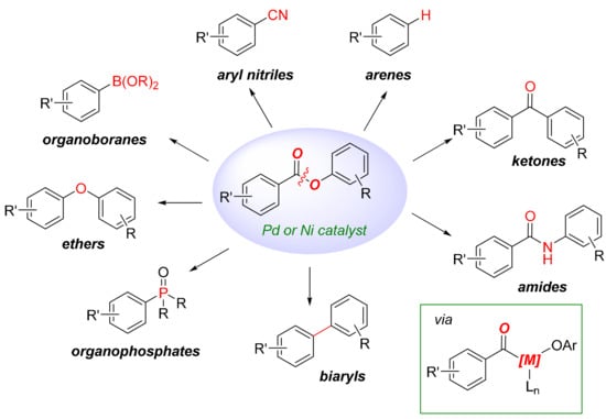 - Takise, R.; Muto, K.; Yamaguchi, J. Cross-Coupling of Aromatic Esters and Amides. Chem. Soc. Rev. 2017, 46, 5864–5888. [Google Scholar] [CrossRef]