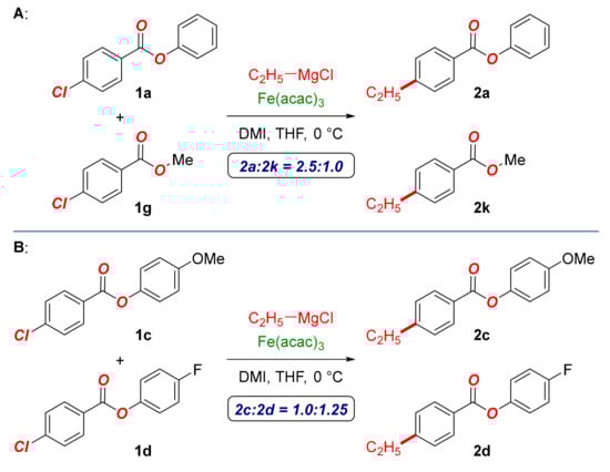 According to the general procedure, an oven-dried vial equipped with a stir bar was charged with two chloride substrates (each 0.50 mmol, 1.0 equiv) and Fe(acac)3 (5 mol%), which was placed under a positive pressure of argon and subjected to three evacuation/backfilling cycles under vacuum. Tetrahydrofuran (0.15 M) and DMI (neat, 200 mol%) were sequentially added with vigorous stirring at room temperature, the reaction mixture was cooled to 0 °C, a solution of C2H5MgCl (2.0 M in THF, 0.25 mmol, 0.50 equiv) was added dropwise over 60 min with vigorous stirring, and the reaction mixture was stirred for 180 min at 0 °C. Following the standard work up, the sample was analyzed by 1H-NMR (CDCl3, 400 MHz) and GC-MS to obtain the conversion, yield, and selectivity using an internal standard and comparison with authentic samples.