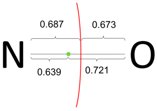 Let us consider first the rather simple (CH3)3NO molecule. In order to fulfill the octet rule for N, a single bond between formal N(+) and O(−) is assumed as the dominant Lewis structure. Then, applying the ionic approximation one assign the two electrons of the σ N-O bond to the O atom, and all N-C bond electrons to the N atom, resulting in oxidation states of (−2) for O, (−1) for N and three CH3 units being formally (+1). Both PM and NLMOs point towards the aforementioned Lewis structure, showing a single σ-type N-O localized orbital. No localized orbital corresponding to a N-O π bond is found and, instead, the O moiety bears two p-type lone-pairs. However, as sketched in Figure 4, the centroid of the σ orbital is closer to N than to O atom, and it lies within the atomic basin of N. Thus, for both CA and BA criteria the electron pair corresponding to the N-O σ bond should be assigned to N, leading to a final formal OS of (0) for O and (−3) for N. It is remarkable that the same alternative assignment was obtained using EOS analysis for the same level of theory, and even for a multireference wave function [5]. It appears that the actual electronic structure of this molecule is at odds with the straightforward application of the ionic approximation.