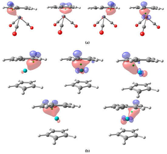 Let us see how the CA and BA schemes perform. We have carried out the analysis using NLMOs. for the three π-adducts V(CO)3(C7H7), Mo(C7H7)(C5H5), and Mn(C7H7)2. In the first case, there are four localized NLMOs that involve the π system of the ligand, as shown in Figure 6a. The centroids of the localized orbitals lie below the plane, as there is some contribution from the d-orbitals of the TM. In one of them, the contribution from the TM is so relevant that the centroid is pulled from the π-ligand (1.317 Å) on to the V center (0.957 Å), that keeps the electron pair applying both CA and BA criteria. The remaining localized orbitals are associated to the ligand and the final OS assignment is neutral CO ligands, (−1) V and (+1) for the π-ligand. It is worth mentioning that, while (+1) is a plausible assignment for C7H7, this result differs from that obtained with EOS, leading to a (+3) V and a 10π aromatic (−3) C7H7 [5].
