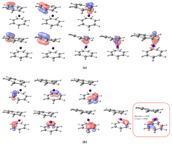 Isocontour plot (0.1) of NLMO localized on top (a) and bottom (b) π-ligands for Mn(C7H7)2. In each case, top three orbitals correspond to alpha spin, and bottom five to beta spin. Orbital centroid represented by green dots.