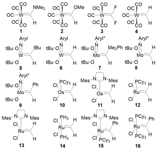 The last set of systems studied are the set of sixteen TM carbenes compiled by Occhipinti et al. [45] and depicted in Figure 8. The set includes four conventional W-based Fischer carbenes (1–4), five Schrock W- and Mo-based catalysts (5–9) and six Ru- and Os-based first- and second generation Grubbs catalysts (10–14) and precatalysts (15–16). We have applied both EOS analysis and CA and BA centroid-based schemes using PM and NLMOs. The key issue is to check the location of the centroids associated to the σ and π TM-carbene bonds (provided they are retrieved by the orbital localization procedure).