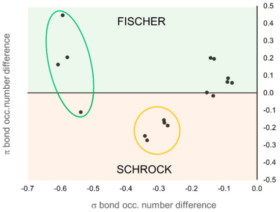 According to EOS analysis, the OS of the carbene unit is either neutral (0) or anionic (−2) in all cases. The expected result is obtained for all TM carbenes predefined as Fischer or Schrock, with only one exception. In the case of Grubbs-type carbenes, the low R values, near 50% in some cases, indicate that the occupation number of the frontier EFOs on the TM and the carbene are almost degenerate, making the OS assignation uncertain. On the contrary, the OS assignment of the prototypical Schrock carbenes is clearer. In this case, the carbene unit keeps all four electrons of the bonds and becomes formally anionic (−2). These results can be easily visualized in Figure 9. Each molecule is represented by a point in the graph, and its position is determined by the difference of the occupation number of the σ (x-axis) and π (y-axis) EFOs of the TM and the carbene. Negative values indicate a larger occupation on the carbene.
