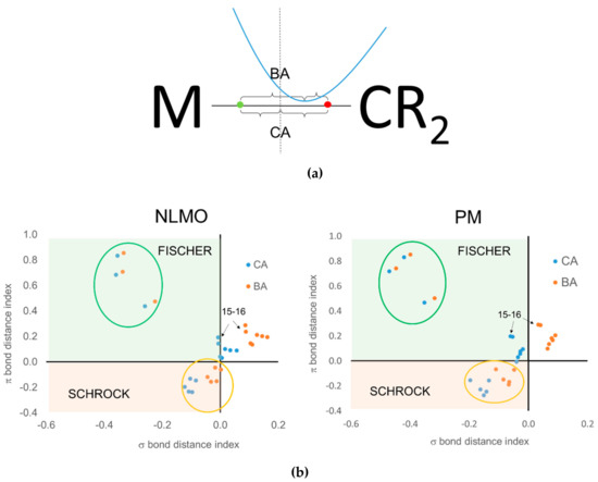 When using the centroids of localized orbitals, the relative occupation number of the EFOs can be replaced by appropriate distances (see Figure 10a) in order to obtain a graphical representation like that of Figure 9. When using the CA criterion, the σ and π bond distance indices used in Figure 10b are given by the distance between the σ (red dot) and π (green dot) centroids to the midpoint of the TM-carbene bond. In the case of the BA criterion, the reference point becomes roughly the position of the bcp. Again, negative distances indicate that the electrons are assigned to the carbene moiety. For instance, Figure 10a illustrates the situation where both CA and BA criteria would be consistent with a Fischer-type neutral carbene. The green dot should be located to the right of the bcp in order for both approaches to predict a Schrock-type carbene. Having to consider two centroids at a time increases the risk of getting a different answer from CA and BA criteria, as is indeed the case.