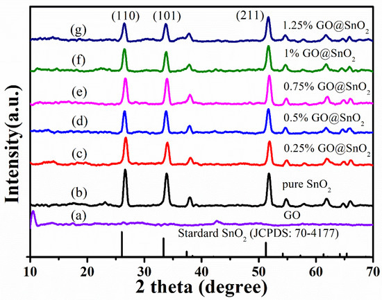 XRD patterns of (a) GO, (b) SnO2 NF/NSs and (c–g) GO@SnO2 NF/NSs nanocomposites with different GO content.
