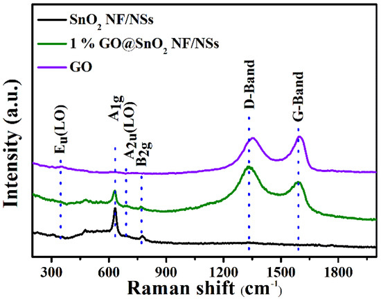 Raman spectra of pure SnO2 NF/NSs, 1% GO@SnO2 NF/NSs and pure GO nanosheets.
