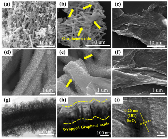 SEM was conducted to investigate the morphologies of pristine SnO2 NF/NSs, 1% GO@SnO2 NF/NSs and GO nanosheets. As observed in Figure 3a,d, the diameter and length of hierarchical SnO2 NF/NSs are about 700 nm and tens of micrometers, respectively. Furthermore, SnO2 nanosheet arrays vertically grew and were uniformly distributed on the surface of SnO2 nanofibers with high length–diameter ratio. The special orientation and open structure expose the whole surface to the gas atmosphere, which can enhance surface active sites and improve the absorption ability to target gas molecules. As can be seen in Figure 3c,f, GO showed gossamery nanosheet structure with slight and disordered wrinkles, which makes it produce a large specific surface area [24]. Figure 3b,e displayed the SEM images of 1% GO@SnO2 NF/NSs. Obviously, hierarchical SnO2 NF/NSs were coated by GO nanosheets, and a few of GO nanosheets were embedded into interspace among these SnO2 NF/NSs. It is noteworthy that GO nanosheets showed a crumpled, rippled morphology and adhered to the surface of pure SnO2 NF/NSs tightly. In addition, GO nanosheets evenly distributed in hierarchical SnO2 NF/NSs and formed network. Compared with pure hierarchical SnO2 NF/NSs, the intersecting bonding and good contacts between SnO2 NF/NSs and GO nanosheets can generate more electrical connection paths, which can significantly improve the electron transfer in gas sensing test [21]. Moreover, these special structures constructed by hierarchical SnO2 NF/NSs and GO nanosheets can make the diffusion and adsorption of gas molecules more effective than that of the pure SnO2 NF/NSs, which can contribute to the improvement of gas-sensing performance [32]. To further study the microstructure of GO@SnO2 NF/NSs nanocomposites, TEM and high-resolution TEM (HRTEM) were carried out and shown in Figure 3g–i. Figure 3g showed the TEM image of GO@SnO2 NF/NSs nanocomposites, which demonstrated that GO nanosheets had successfully been loaded on the surface of hierarchical SnO2 with a diameter of about 700 nm. As can be seen in Figure 3g,h, thin and wrinkled GO nanosheets adhered to the surface of SnO2 nanosheet arrays. There is a good contact and intersecting bonding between hierarchical SnO2 NF/NSs and GO nanosheets, which corresponds to the observed SEM result of the GO@SnO2 NF/NSs from Figure 3b,e. The lattice space of 0.26 nm measured in Figure 3i matches well with the (101) planes of tetragonal rutile SnO2. No other impure lattice was observed, which was consistent with the XRD analysis.