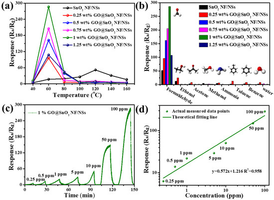 (a) The responses of gas sensors toward 100 ppm formaldehyde at different operation temperatures. (b) Responses of the gas sensors to different test gases at their respective optimal operating temperatures. (c) Response of 1% GO@SnO2 NF/NSs nanocomposites toward HCHO gas in concentration ranges of 0.25–100 ppm at 60 °C. (d) Linear approximation of the detection limit with 1% GO@SnO2 NF/NSs nanocomposite.