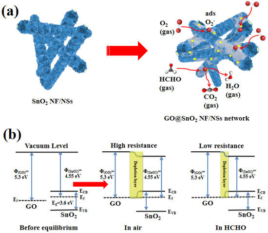 Schematic illustration of HCHO gas sensing mechanism for (a) pure SnO2 NF/NSs and GO@SnO2 NF/NSs nanocomposite; (b) the energy band structures of GO@SnO2 NF/NSs nanocomposite in different gas atmospheres.