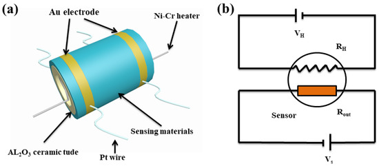 A paste was obtained by mixing the prepared GO@SnO2 NF/NSs with a certain amount of water at a ratio of 4:1, and a ceramic tube with a pair of gold electrodes was coated by the prepared sensing material with a small brush. A Ni-Cr heating inserted into the ceramic tube was applied to provide a certain operation temperature by a temperature controller. The general structure of gas sensor and the test circuit were displayed in Figure 7a,b, respectively. For the reducing gases and n-type metal oxide semiconductor, the response of gas sensors was defined as the ratio of Ra and Rg, where Ra and Rg are the resistance in air and target gas, respectively. The times taken by the resistance ranging from Ra to Ra − 90% (Ra − Rg) and from Rg to Rg + 90% (Ra − Rg) are defined as the response and recovery times when the sensor is exposed to the target gas and retrieved from the target gas, respectively.