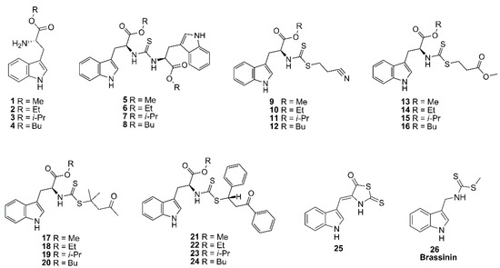 Structural classification of the test indole-containing phytoalexin analogs: 2-alkyl aminoesters (1–4), N,N-dialkylthioureas (5–8), 2-cyanoethyl N-alkyldithiocarbamates (9–12), 3-methoxy-3-oxopropyl N-alkyldithiocarbamate (13–16), 2-methyl-4-oxopentan-2-yl N-alkyldithiocarbamate (17–20), 2-oxo-1,3-diphenylpropyl N-alkyldithiocarbamates (21–24), 4-[(1H-indol-3-yl) methylene]-2-sulfanilidene-1,3-thiazolidin-5-one (25), brassinin (26).