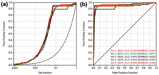 Benchmarking of the docking protocol using a set of active compounds decoys against test enzymes (red line = isocitrate lyase; green line = aspartate kinase; black line = serine esterase; purple line = lanosterol 14α-demethylase; dark orange line = trichothecene acetyltransferase). (a) Receiver operating characteristic (ROC). (b) Enrichment curve.