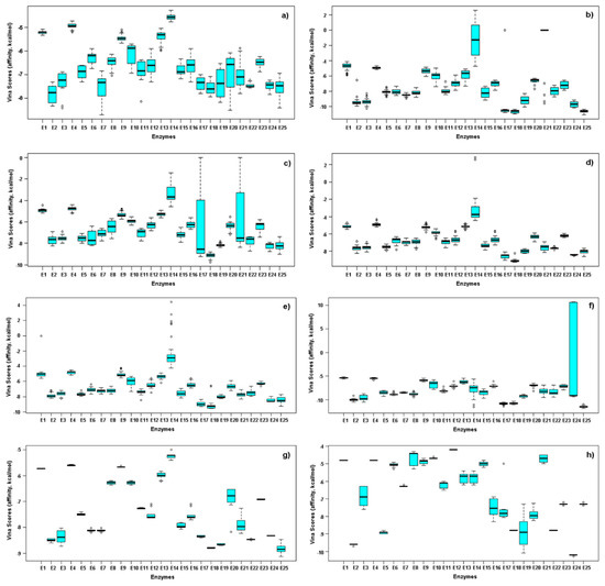 In order to observe the particular variation/distribution of Vina scores between enzymes and test ligands, the respective box plots were also constructed using the whole dataset (Figure 3). Thus, 12 enzymes exhibited good reproducibility and low dispersion in the docking calculations for six types of ligands, whereas AAE and CE-DTC showed more data scattering.