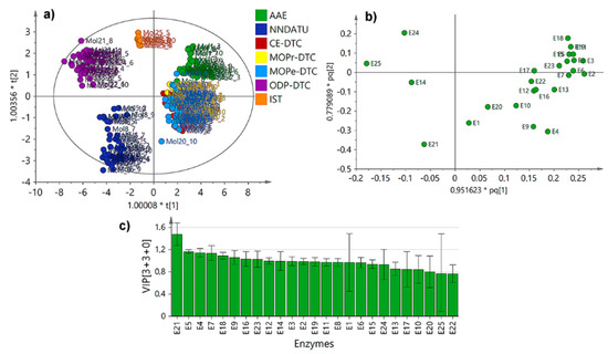 The respective loadings plot (Figure 4b) exposed those variables (i.e., enzymes) that influence the observations (i.e., test analogs) discriminations across the Vina scores. In this regard, NNDATU, IST and ODP-DTC were reasonably influenced by the resulting docking scores with the E14, E21, E24 and E25, which are related to the lyase, dehydrogenase, and oxidoreductase enzyme families, respectively. The influence contribution of variables across dataset within the OPLS-DA model [3+3+0] was estimated by the variable importance in projection (VIP) scores. E25 showed the most deviated VIP score, indicating probable good selectivity on the contribution particularly due to lowest docking scores for some specific compound types (such as ODP-DTC), whereas E21 exhibited the highest one, i.e., poorest selectivity by some compound dataset (such as NNDATU). Particularly, NNDATU possessed several chemical and biological properties that are directly related to their molecular structure. Their observed differences are due to their substitutions and such specific conformations they can adopt around the thioamide moiety [17].