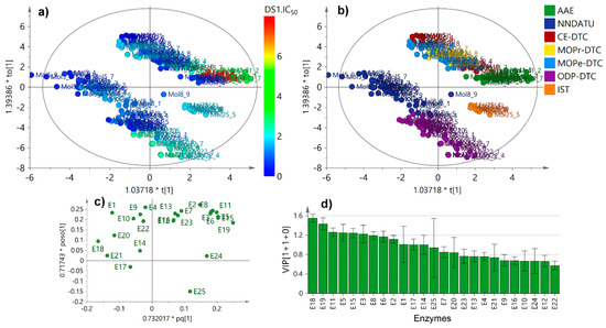 Once again, the well-defined, separated groups were NNDATU, OPD-DTC and IST. These results can rationalized since NNDATU and OPD-DTC exhibited similar docking profile between them, whereas IST was slightly different; however, these three kind of compounds were very distinct from the others. This fact represented a clear trend between docking scores performance and the experimental IC50 values based on compound type, justifying conceivable structure-activity and structure-affinity relationships. Furthermore, the differential variables (i.e., enzymes) were identified through the loadings. The respective loadings plot (Figure 5c) showed a remarkable influence of E14, E17, E18, E20 and E21 for the separation of NNDATU-based clusters, while IST and OPD-DTC were most influenced by E24 and E25, respectively. Therefore, these results are in accordance with the respective box-plots (Figure 2) using only the Vina scores performance for each compound type. Twelve enzymes revealed VIP scores ≥ 1.0 under IC50 supervision, thus, they can be considered important in the given model to integrate in silico docking scores and in-vitro antifungal activity (Figure 5d). In this regard, E18 was the most influencing variable, and E25 persisted as the most deviated influencing enzyme. This last fact is an indicative of a particular selectivity of some compounds (i.e., OPD-DTC-type) to interact with this enzyme (E25).