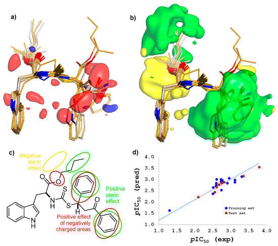 Comparative molecular field analysis (CoMFA). Steric (a) and Electrostatic (b) maps after the CoMFA model. Green and yellow contours expose positions where a bulky group would be favorable and unfavorable, respectively. Blue and red contours comprise regions where an increase of positive and negative charges, respectively, will enhance the antifungal activity; (c) schematic representation of the steric and electrostatic contributions according to CoMFA using 24 as model compound; (d) CoMFA predicted as experimental pIC50 values.