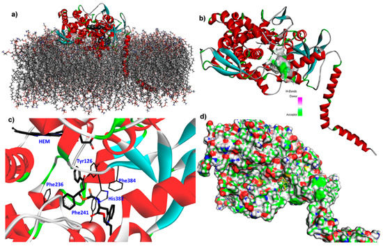 (a) F. cerealis lanosterol 14α-demethylase (FcLDM), E25, model, embedded in a 266-lipids bilayer of 1-palmitoyl-2-oleoylphosphatidylethanolamine (OPPEA) and docked with compound 24; (b) Interaction surface of E25 and best-docked pose of 24 (contour related to the donor (pink) and acceptor (green) zones with the interface); (c) three-dimensional (3D) model of lowest-energy docked pose of 24 within active site of FcLDM (selected residues at active site of FcLDM are marked in gray light sticks; remaining enzyme polycolored cartoon; ligand 24 in gray bold sticks; (d) 3D model of solvent-accessible surface area (SASA) of FcLDM with the lowest-energy docked pose of 24 within its active site (ligand 24 in yellow sticks).