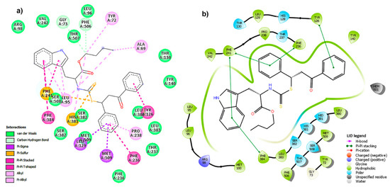 Two-dimensional (2D) plots for FcLDM (E25):24 complex. (a) 2D-residual interaction diagram using Discovery Studio Client (interaction type is differentiated by colored circles (residues) and dashed lines (directed to the ligand moiety) according to the convention); (b) ligand interaction diagram (LID) using Maestro 11.5 [light green lines depicts the active site surface, dark green lines indicate the π-π stacking between residue and aromatic moieties of 24; residues are differentiated by colors according to the interaction type as indicated in LID legend: hydrophobic (green), polar (aquamarine), positive charge (purple)].