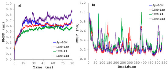(a) Root mean square deviations (RMSD), along the trajectories simulated by molecular dynamics during 90 ns, for the FcLDM (E25) (apoenzyme), and docked separately with 24, lanosterol (Lan) and brassinin (Bra); (b) root mean quadratic fluctuations (RMSF) along the trajectories simulated by molecular dynamics during 90 ns, for the FcLDM (E25) (apoenzyme), and docked separately with 24, lanosterol (Lan) and brassinin (Bra).