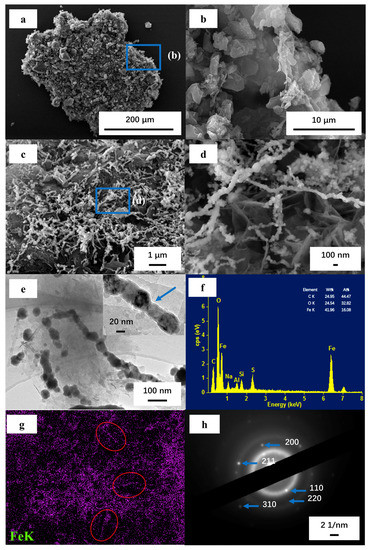 (a,b) Scanning electron microscope (SEM) images of MAC (b is the amplification image of the corresponding dotted box in a); (c,d) SEM images of nZVI–MAC (d is the amplification image of the corresponding dotted box in c); (e) HRTEM image of nZVI–MAC; (f) Energy dispersive spectrum(EDS) spectrum of nZVI–MAC; (g) EDS mapping of (c); and (h) SAED image of nZVI–MAC.
