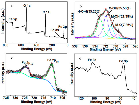XPS spectra of the nZVI–MAC: (a) full spectrum; (b) O 1s; (c) Fe 2p; (d) Fe 3s and Fe 3p.
