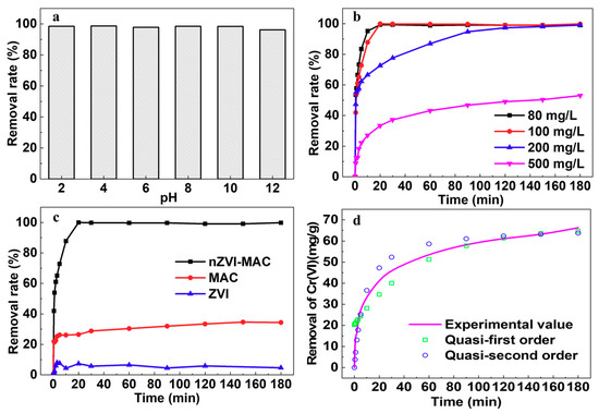The pH (a), initial concentration (b), the different reagents of nZVI-MAC/MAC/nZVI (c) effect on the removal of Cr(VI) by nZVI-MAC (d), adsorption kinetics of Cr(VI) by nZVI-MAC (a: initial concentration: 100 mg/L; reagent dosage: 0.2 g/50 mL; reaction equilibrium time: 3 h; temperature: 25 °C; b: pH: 4; reagent dosage: 2 g/500 mL; oscillation speed: 130 rpm; temperature: 25 °C; c: initial concentration: 100 mg/L; pH: 4; reagent dosage: 2 g/500 mL; oscillation speed: 130 rpm; temperature: 25 °C; d: initial concentration: 500 mg/L; pH: 4; reagent dosage: 2 g/500 mL; oscillation speed: 130 rpm; temperature: 25 °C).
