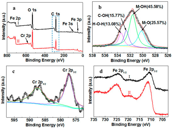 To better understand the mechanisms of Cr(VI) removal, the elemental composition of the nZVI–MAC composites before (I) and after (II) Cr(VI) adsorption was further analysed by XPS (Figure 5a). The C 1s peak of nZVI–MAC greatly decreased, while a new peak assigned to Cr 2p appeared due to the fast reduction of Cr(VI) by ZVI, and the produced Cr(III) was coprecipitated with iron ions on the surface. The spectrum of Cr 2p (Figure 5c) can be fitted by two peaks at 587.5 for Cr 2p1/2 and 577.5 eV for Cr 2p3/2, indicating that Cr(VI) is reduced to Cr(III). After the removal of Cr(VI) ions, the ratio of M–OH increased from 21.38% to 45.58%, and C–OH decreased from 35.53% to 15.77%, indicating that –OH and –COOH may be involved in the removal of Cr(VI).