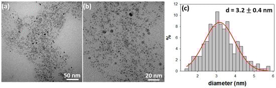 TEM images (a,b) and size distribution histogram (c) of the electrosynthesized copper nanoparticles (CuNPs) stabilized by benzalkonium chloride (BAC)(CuNPs@BAC) (0.1 M, 1.5 V). The mean NP core diameter is reported in the inset, along with the relevant standard deviation (n = 225).