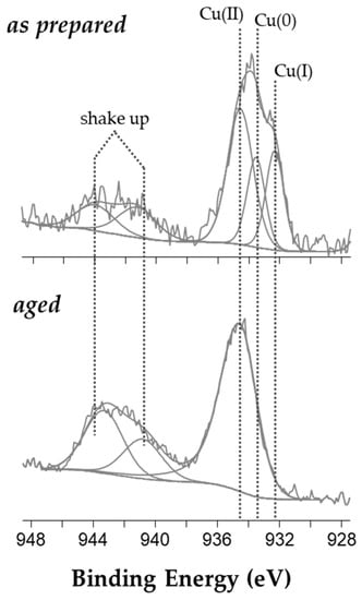 In particular, the signal analysis of the spectrum relevant to a pristine nanocolloid resulted in five peak components: two shake-up features (spectral region, 940–945 eV) and a photoelectron peak at 934.5 ± 0.2 eV, recalling the presence of Cu2+ species [31]. Two more components were found at 933.5 ± 0.2 and at 932.3 ± 0.2 eV, and respectively ascribed to nanodispersed Cu(0) [19,32,33] and to CuCl+ complexes (also evident from XP Cl2p region, data not shown). After ageing in air, the Cu2p3/2 signal shape appeared to be different and the curve fitting resulted in two shake-up shoulders and only one photoelectron peak at 934.5 ± 0.2 eV. All those components were attributed to Cu(II), revealing the complete oxidation of copper cores in less than one month of air exposure.