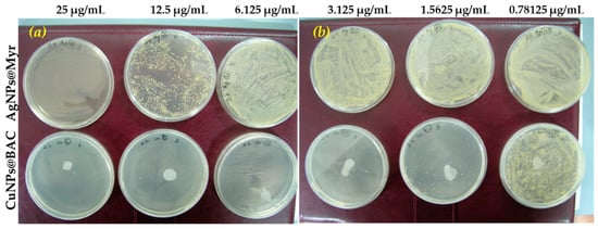 In a second experiment, the biological results were obtained by evaluating the minimum inhibitory concentration (MIC) of the antimicrobial agent needed to completely inhibit microorganisms’ growth and proliferation. The antimicrobial activity tests were performed comparing the performance of CuNPs@BAC samples with those of a model synergistic nanoantimicrobial, namely, myramistin-capped silver nanoparticles, AgNPs@Myr, which has been reported to be a strong disinfectant nanomaterial [37].