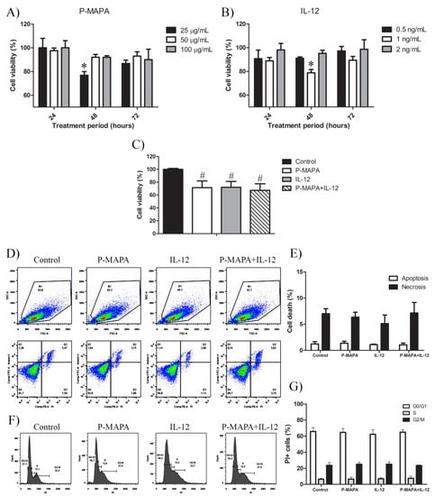 Protein aggregate magnesium–ammonium phospholinoleate–palmitoleate anhydride (P-MAPA) and interleukin-12 (IL-12) suppress cell viability without changing the apoptosis rate and cell cycle. SKOV-3 cells were treated with various concentrations of P-MAPA (A) and IL-12 (B) for 24, 48, and 72 h, and the cytotoxicity (expressed as percentage) was assayed by MTT; (C) Cell viability (%) after standardization of treatments (25 µg P-MAPA and 1 ng IL-12) after 48 h exposure; 1 × 103 SKOV-3 cells showed the best reproducibility. (D) Representative apoptotic index in SKOV-3 cells treated with P-MAPA and IL-12 for 48 h detected by annexin V/PI flow cytometry. (E) Percentage of cells in apoptosis and necrosis. (F) Representative cell cycle analysis in SKOV-3 cells treated with P-MAPA and IL-12 for 48 h detected by PI and RNAase flow cytometry. (G) Percentage of PI+ cells in G0/G1, S, and G2/M phases. The samples were assayed in three technical and biological replicates. Results are expressed as the mean ± SD and described as column chart. * p < 0.05 vs. different doses at 48 h; # p < 0.05 vs. control group.