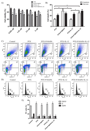 To better understand whether P-MAPA and IL-12 therapies potentially increase the effect of standard chemotherapy, they were tested in association with PTX (Figure 2A,B). After 48 h, P-MAPA decreased cell viability in association with different doses of PTX compared with cells treated with PTX only (~30% reduction with 5 µM PTX; ~30% reduction with 2.5 µM PTX; ~24% reduction with 1.25 µM PTX and ~34% reduction with 0.625 µM PTX). Because IL-12 had no effect on cell viability when associated with PTX, the decreased cell viability observed after combining P-MAPA with IL-12 in association with doses of PTX is probably due to the P-MAPA effect (~19% reduction with 5 µM PTX, ~30% reduction with 2.5 µM PTX, ~30% reduction with 1.25 µM PTX, and ~38% reduction with 0.625 µM PTX). To confirm these effects on SKOV-3 cell death, an Annexin V-FITC/PI assay was performed using the lowest dose of PTX (0.625 µM). Concordantly, with the MTT results, P-MAPA and P-MAPA+IL-12 increased cell death in association with PTX at dose of 0.625 µM. The apoptosis/necrosis ratio of PTX was 0.64 and became higher when associated with P-MAPA (1.18) or P-MAPA+IL-12 (0.88), thus enhancing the P-MAPA effect as apoptotic inductor. Finally, PTX significantly increased the number of cells in G0/G1 and decreased cells in G2/M phase of the cell cycle, thus inducing cell cycle arrest. In this case, the addition of P-MAPA and IL-12 did not potentiate the PTX effects in cell cycle (Figure 2D,E).