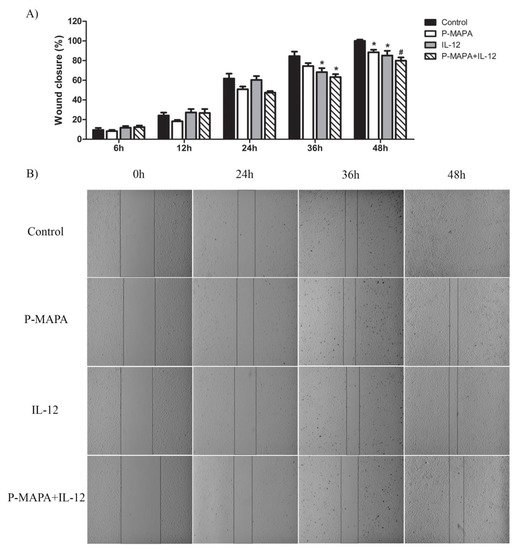 The wound-healing method was performed to verify the effects of P-MAPA and rhIL-12 alone or in combination on cell migration capacity. Briefly, 3 × 105 SKOV-3 cells were placed in 6-well plates with a serum-free culture medium for cell starvation. When the cells reached high confluence, a wound was created through the confluent cell monolayer using an angled tip at 45°, and the SKOV-3 cells were then immediately treated with the pre-determined doses of P-MAPA, rhIL-12, or both, diluted in 2 mL of complete RPMI 1640 medium. Images were obtained at 0 h, 6 h, 12 h, 24 h, 36 h, and 48 h until the wound closure. Migration area (%) was measured using Image-J software. All experiments were analyzed in biological and technical triplicate.