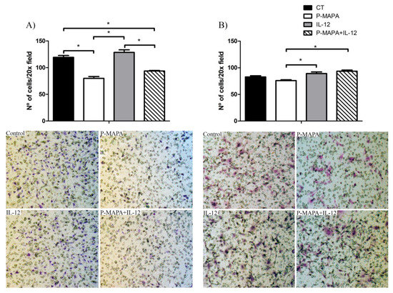 Effects of P-MAPA and IL-12 alone or in combination on the migration and invasion capacity of SKOV-3 cells. (A) Cell migration was measured by the amount of cells located in the lower part of the insert. (B) Cell invasion was determined by the amount of cells located in the lower part of the insert previously covered by Geltrex®. Representative images of the assay were obtained at 20× magnification. The samples were assayed in three technical and biological replicates. Results are expressed as the mean ± SD; * p < 0.05; CT, control group.