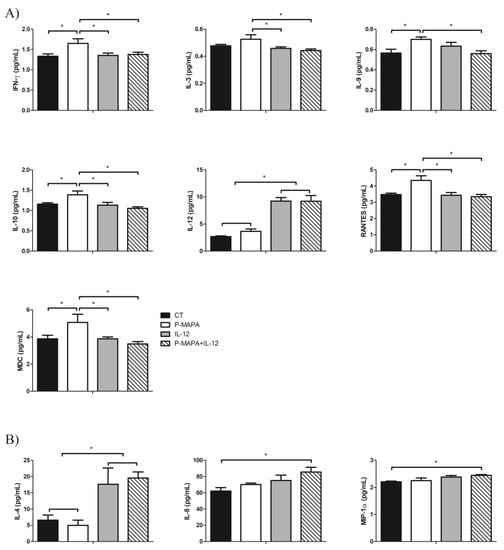 Multiplex analysis of cytokines and chemokines produced by SKOV-3 cells in response to P-MAPA and IL-12 treatments. (A) Concentrations of IFN-γ, IL-3, IL-9, IL-10, IL-12, RANTES, and MDC were altered in the supernatants of cell culture. (B) Levels of IL-4, IL-8, and MIP-1α were altered in SKOV-3 cell extracts. All data are expressed as the mean ± SD. * p < 0.05 as compared with the corresponding group; One-way ANOVA complemented by the Tukey test. The samples were assayed in three technical and biological replicates. CT, control; IFN-γ, interferon gamma; RANTES, regulated on activation, normal T cell expressed and secreted; MDC, macrophage-derived chemokine; MIP-1α, macrophage inflammatory protein 1-alpha.