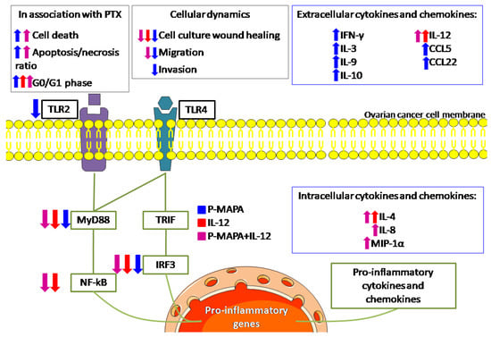 Schematic view of the effects of P-MAPA and IL-12 on human SKOV-3 cells. The effect of each treatment is shown by its representative color. Up and down arrows indicate whether the treatment increased or decreased, respectively, such as cellular function or molecule at these levels. The treatments reduced the downstream molecules (MyD88, NF-kB, and IRF3, with the exception of P-MAPA in reducing NF-kB) of both canonical and non-canonical toll-like receptor (TLR) signaling pathways, and only P-MAPA significantly downregulated the TLR2 levels. The intracellular cytokine/chemokine levels were increased after treatment with IL-12 (IL-4) or P-MAPA+IL-12 (IL-4, IL-8 and MIP-1α); P-MAPA was more effective in increasing the secretion of the following cytokines/chemokines: IFN-γ, IL-3, IL-9, IL-10, RANTES/CCL5, MDC/CCL22). As expected, IL-12 was used to treat SKOV-3 cells and appeared increased after IL-12 and P-MAPA+IL-12 treatments. Although IL-12 only reduced the SKOV-3 cells’ wound closure, P-MAPA efficiently regulated the cellular dynamics by reducing the wound closure, cell migration and invasion. The combination of P-MAPA with IL-12 decreased the period of wound closure and cell migration rate. MyD88, myeloid differentiation primary response 88; NF-kB, nuclear factor kappa B; TRIF, TIR-domain-containing adapter-inducing interferon-β; IRF-3, interferon regulatory factor 3; TLR2, toll-like receptor 2; TLR4, toll-like receptor 4; P-MAPA, protein aggregate magnesium-ammonium phospholinoleate-palmitoleate anhydride; IL, interleukin; MIP-1α, macrophage inflammatory protein 1α; IFN-γ, interferon gamma; RANTES, regulated on activation, normal T cell expressed and secreted; MDC, macrophage-derived chemokine; CCL, C-C motif chemokine ligand.
