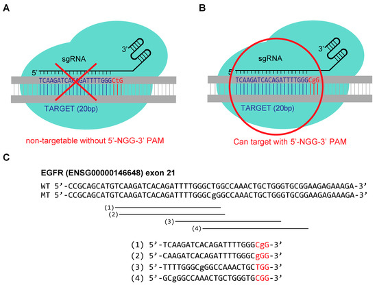 Schematic of the protospacer adjacent motif (PAM)-based guide RNA design for the targeting of the 2573T > G endothelial growth factor receptor (EGFR) point mutation. (A) Shown are the sequence of wild type EGFR (2573T), in grey, and the ribonucleoprotein complex comprised of CRISPR-Cas9 and guide RNA, in cyan. The PAM sequence is shown in red characters. (B) Schematic of the mutant sequence of EGFR (2573T > G), CRISPR-Cas9, and guide RNA. Lower-case letters indicate the 2573T > G mutation of EGFR. (C) Design of the four sgRNAs with single-base mismatches in PAM or within the guide RNA complementary sequences, indicated in lower-case letters.