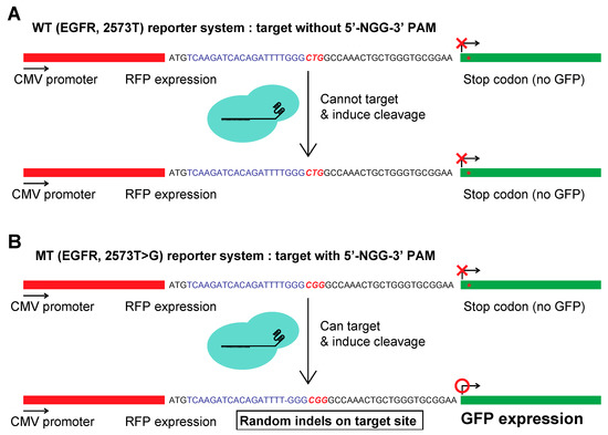 Schematic of the targeting of the RFP-GFP reporter system by CRISPR-Cas9. (A,B) Shown are the reporter construct with the wild type EGFR (2573T) and mutant EGFR (2573T > G) sequence flanked by red fluorescent protein (RFP) and green fluorescent protein (GFP). The PAM-based sgRNA sequence and its PAM are shown in blue and red, respectively.