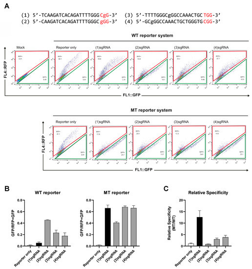 The following are available online, Figure S1: Flow cytometry analyses of the genome editing specificities of the sgRNAs targeting the RFP-GFP dual reporters. (A) and (B) indicate the fluorescence profiles of biological replicates, Figure S2. T7E1 analyses of the 15 candidate off-target sites. (A) Off-target analyses of off-targets using MT reporter and sgRNA(1). (B) Analyses of off-targets using WT reporter and sgRNA(1).