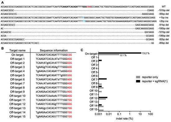Indel patterns and off-target analyses by T7E1 assay. (A) Shown are the most abundant 10 indel patterns of the on-target site by genome editing with sgRNA-1. The PAM sequence and insertions are indicated by red and blue characters, respectively. (B) Shown are the sequences of potential 15 off-target sites. Mismatches to the on-target sequence and PAM sequences are indicated by lower-case and red characters, respectively. (C) Shown are the indel rates of the on-target and the 15 candidate off-target sites that were quantified by targeted deep sequencing.
