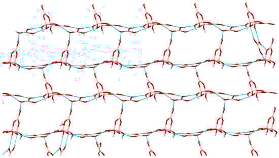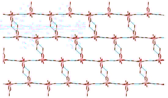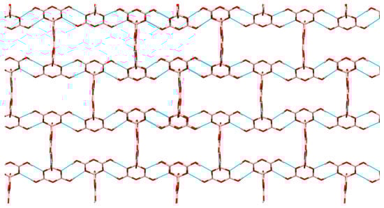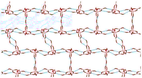 Compounds 2, 3, 7, and 8 all contain the insular pentaborate(1-) anion, [B5O6(OH)4]−. Compound 8 is co-crystallized with 0.5 molecules of H2O. There is some disorder present in the cation and/or co-crystallized molecules all pentaborate(1-) anion structures except 3. Bond lengths and bond angles found for C, N atoms within the organic cations [19,28,37,40,41] are as expected as are the B-O bond lengths, OBO and BOB angles observed for the [B5O6(OH)4]− anion [19,21,28,29,31,32,33,34,35]; for full details see the Supplementary Information. H-bonding interactions within polyborate salts are extremely common and anion-anion interactions between pentaborate(1-) units, forming giant lattices, are well documented and are signaled as a strong driving force [5,29,34] in templating the crystallization of these anions from the Dynamic Combinatorial Library [42,43,44,45] arising from B(OH)3 under basic conditions [35,36]. The pentaborate (1-) anions in 2, 3, 7, and 8 all form multiple anion-anion interactions and 2 and 3 have additional cation-anion NH…O H-bond interactions. The acceptor sites for the four anion-anion H-bond interactions from each independent pentaborate(1-) anion can be codified [19,37] as α,β,α,α and α,α,α,β (two independent anions) for 2, α,α,α,γ for 3, α,β,α,α for 7, and α,β,α,α and α,α,β,α (two independent anions) for 8. Using Etter nomenclature [46] the H-bond interactions per pentaborate are 3 R22(8) and 1 R22(12) for 2, and 3 R22(8) and 1 C(8) for 3, 7, and 8. Compound 7 adopts the familiar ′herringbone′ structure [29,31] whereas 2, 3 and 8 are unique. The structure of 3 (Figure 2) is similar to the ′stepped brickwall′ structure observed in [4-MepyH, 4-Mepy][B5O6(OH)4] [37]; however the structures are different since 3 has a C(8) interaction involving γ acceptor sites rather than β sites. Views of the anion giant structures in 2 and 8 are given in Figure 3 and Figure 4 respectively.