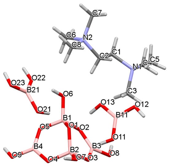 The tetraborate(2-) anion in 9 is found co-crystallized with 2B(OH)3 and 2H2O and the dication [Me3N(CH2)2NMe3]2+. The structure is disordered with the cation occupying three closely related positions with site occupancies of 47.4%, 28.7% and 23.9% and one of the two co-crystallized B(OH)3 units occupying 2 positions with site occupancies of 76% and 24%. A drawing of the atomic labelling for the components of highest site occupancy is given in Figure 5. Bond lengths and bond angles found for C, N atoms within the [Me3N(CH2)2NMe3]2+ cations are as expected and similar to those reported for the related pentaborate(1-) salt, [Me3N(CH2)2NMe3][B5O6(OH)4]2. [28]. The B-O bond lengths, OBO and BOB angles observed for the [B4O5(OH)4]2− and B(OH)3 motifs are in accord with previous tetraborate(2-) [47,48,49,50,51,52,53,54,55,56] and polyborates with co-crystallized B(OH)3 [32,33,39,55,57,58]; for full details see the Supplementary Information.
