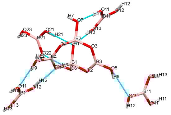 The tetraborate(2-) anion has four H-bond donor sites and nine potential H bond acceptor sites, and the B(OH)3 molecules each have three donor and three potential acceptor sites. Again, there are numerous H-bond interactions within the structure and a giant supramolecular anionic H-bonded lattice is formed, with cations situated within the cavities. However, there are no direct anion-anion interactions within the lattice and the B(OH)3 units serve to bridge tetraborate(2-) anions by acting as ′spacers′ to expand the lattice so that it can accommodate the relatively large cation, [Me3N(CH2)2NMe3]. This spacer role for B(OH)3 has been observed before [32,33,39,55,56,57,58]. With reference to Figure 6 it can be seen that the H-bond structure can be envisaged as ′horizontal′ chains of alternating [B4O5(OH)4]2-/B(OH)3 units held together by R22(8) interaction, crosslinked by ′vertical′ C22(8) chains (involving O8,H8…O12,H12…O5,B1,O2,B3) in a regular 2D arrangement. These planes are further linked by additional R22(8) interactions into a 3D lattice. Further details of the interactions around the tetraborate(2-) anion is shown in Figure 7 and full details are available in the Supplementary Information. The O1 site is a double H-bond acceptor in two R22(8) interactions: O21H21…O1 and O13H13…O1. The H2O of crystallization further help to H-bond the structure together. The cation is unable to get involved with H-bonding.