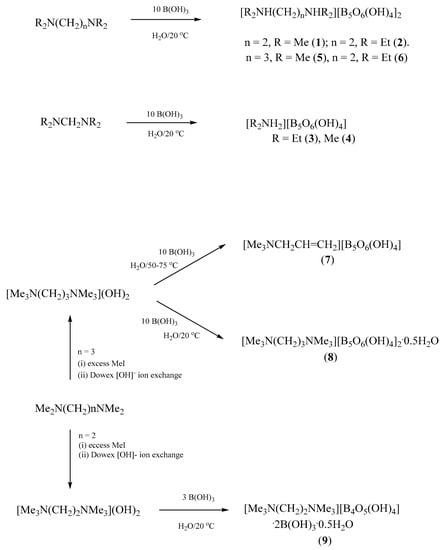 - Visi, M.Z.; Knobler, C.B.; Owen, J.J.; Khan, M.I.; Schubert, D.M. Structures of self-assembled nonmetal borates derived from α,ω-diaminoalkanes. Cryst. Growth Des. 2006, 6, 538–545. [Google Scholar] [CrossRef]