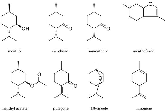 Both menthol-rich mint oils have monographs in the European Pharmacopoeia 5 (EP 5) [28] as Peppermint oil and Mint oil partly dementholized, respectively. EP 5 defines mint oils as colorless, pale yellow, or pale greenish-yellow liquids with a characteristic odor. EP 5 establishes the limits of 10 key components in peppermint oil determined by GC analysis: menthol (30.0–55.0%), menthone (14.0–32.0%), isomenthone (1.5–10.0%), menthyl acetate (2.8–10.0%), menthofuran (1.0–9.0%), 1,8-cineole (3.5–4.0%), limonene (1.0–5.0%), isopulegol (max. 0.2%), pulegone (max. 4.0%), and carvone (max. 1.0%). The limits of these compounds in dementholized cornmint oil are similar: menthol (30–50%), menthone (17–35%), isomenthone (5.0–13.0%), menthyl acetate (1.5–7.0%), 1,8-cineole (max. 1.5%), limonene (1.5–7.0%), isopulegol (1–3%), pulegone (max. 2.0%), and carvone (max. 2.0%). The structures of the main constituents of menthol mint oils are presented in Figure 1.