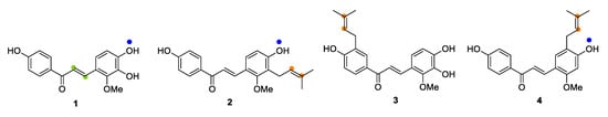 Possible metabolic points of licochalcones B (1), C (2), D (3) and H (4) by A. niger and M. hiemalis, with saturation of the double bond in case of hydrogenation (green), dihydroxylation and epoxidation (orange), and glycosylation (blue).