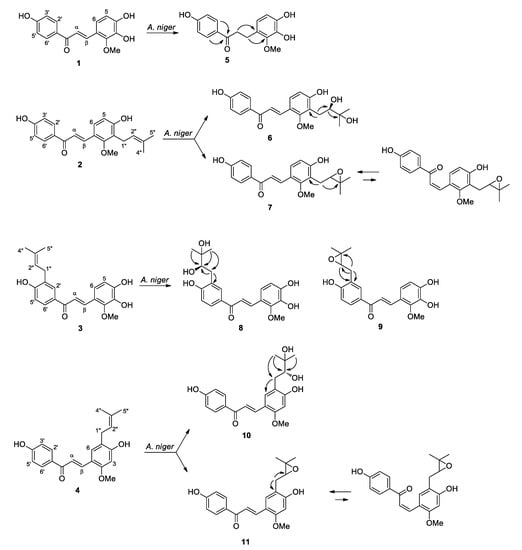 Metabolites 5–11 obtained from microbial transformation of licochalcones B (1), C (2), D (3), and H (4) by A. niger. Selected HMBC correlations (1H→13C) of each metabolite are indicated by arrows.