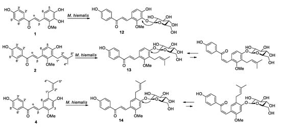 Metabolites 12–14 obtained from microbial transformation of licochalcones B (1), C (2), and H (4) by M. hiemalis. Selected HMBC correlations (1H→13C) of each metabolite are indicated by arrows.